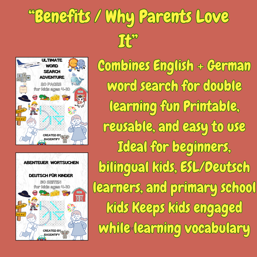 The ultimate bilingual Word Search bundle for kids! 50 pages of fun, educational, and engaging activities: 20-page English Word Search 30-page German Word Search Perfect for ages 4–10, homeschooling, ESL/Deutsch learners, and classroom activities. Printable PDF.