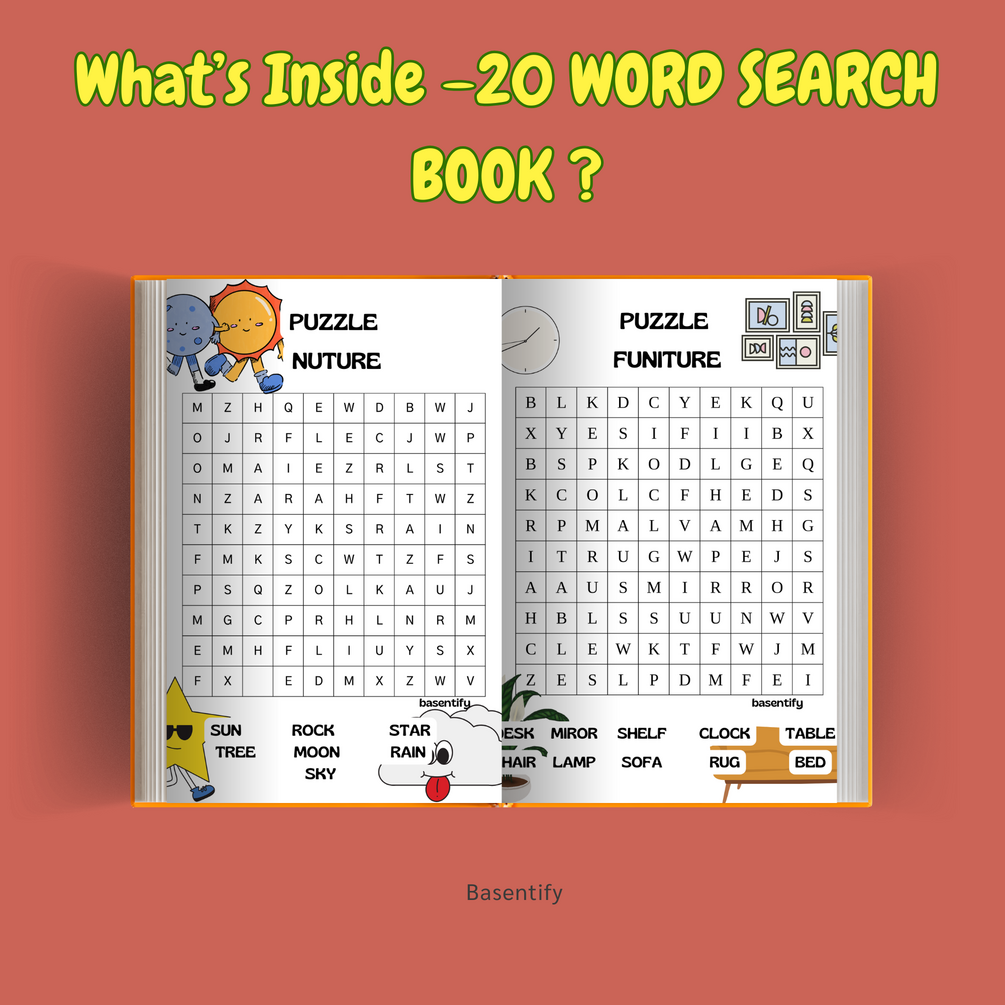 Fun word search puzzles with themes: animals, colors, food, vegetables, fruits, toys, family, body parts, rooms, furniture, transportation, nature, countries, places, jobs