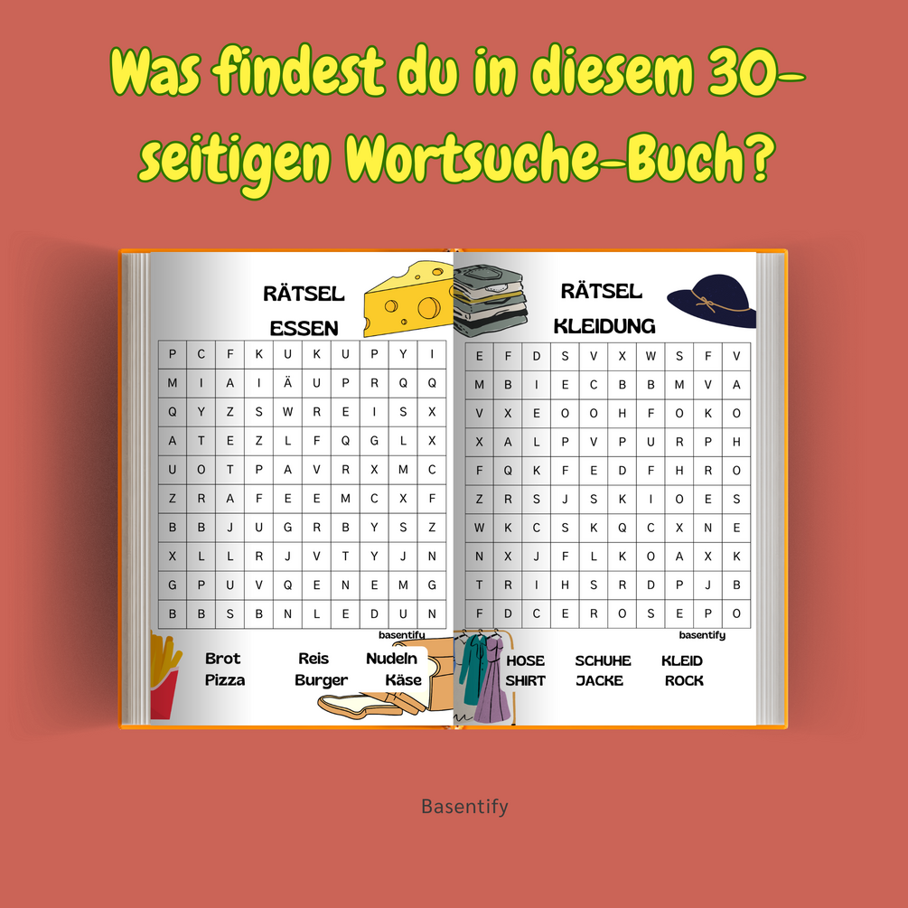 Fun word search puzzles with 30 themes: Tiere im Wald, Bauernhoftiere, Meerestiere, Farben, Essen, Gemüse, Obst, Spielzeug, Familie, Verkehrsmittel, Möbel, Körperteile, Natur, Länder, Orte, Berufe, etc.